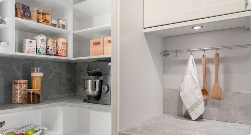 Enhance organization and efficiency with tailored storage solutions like built-in shelving units and pantries.